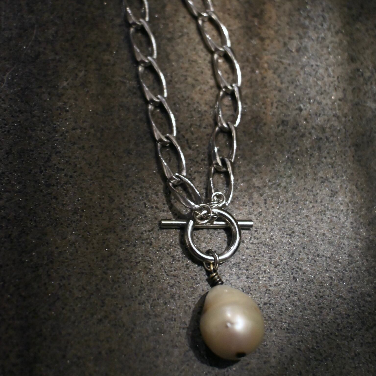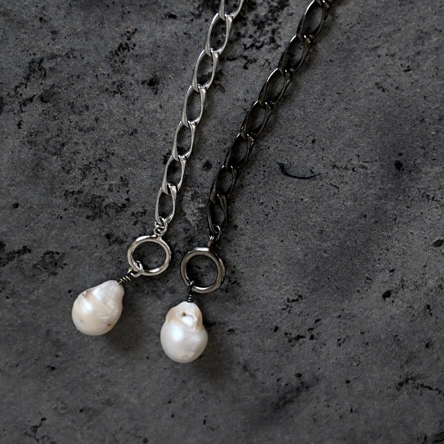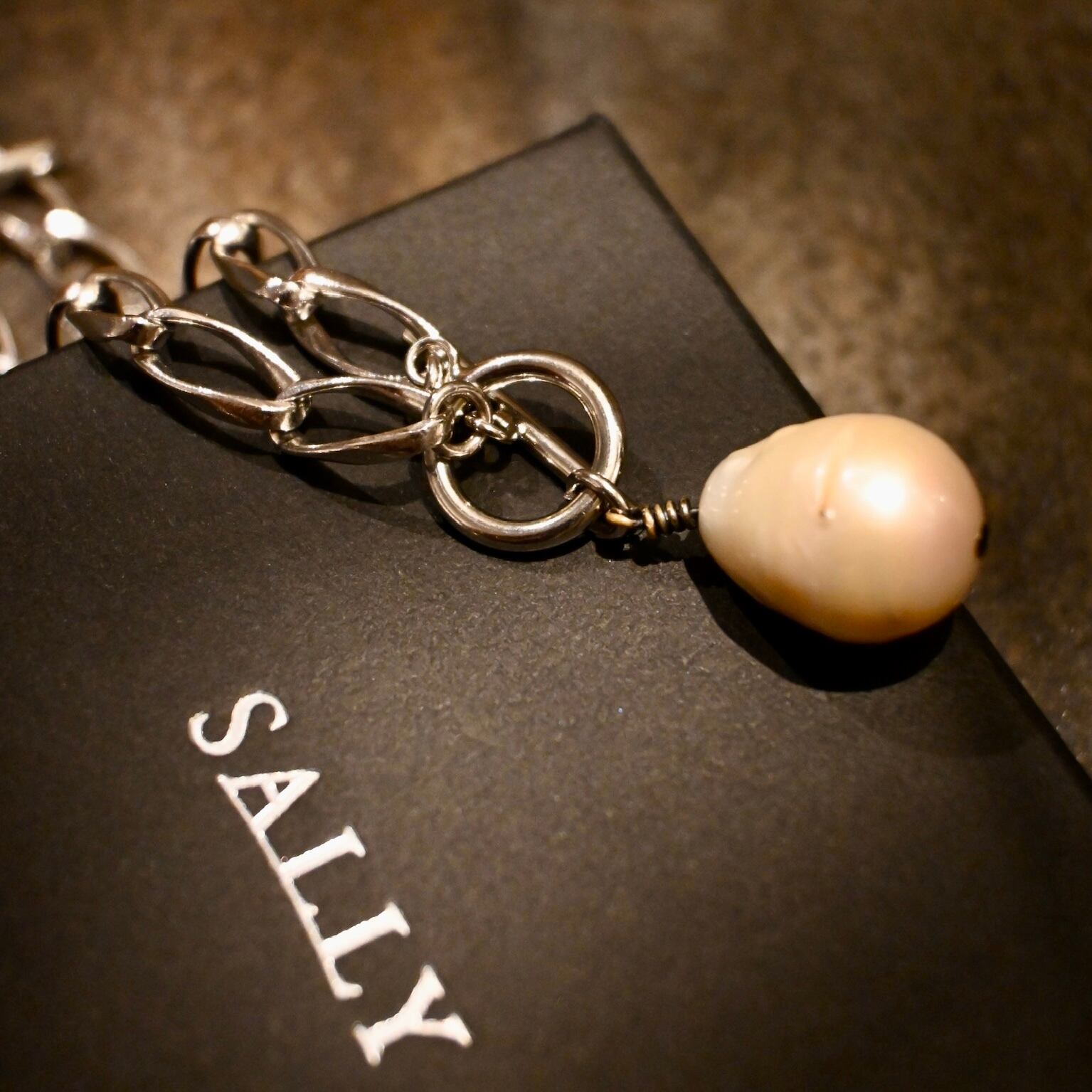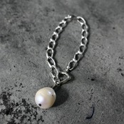 繊細な線形のチェーンと華奢なマンテルが、大粒のパールを引き立てる計算されたデザインです。