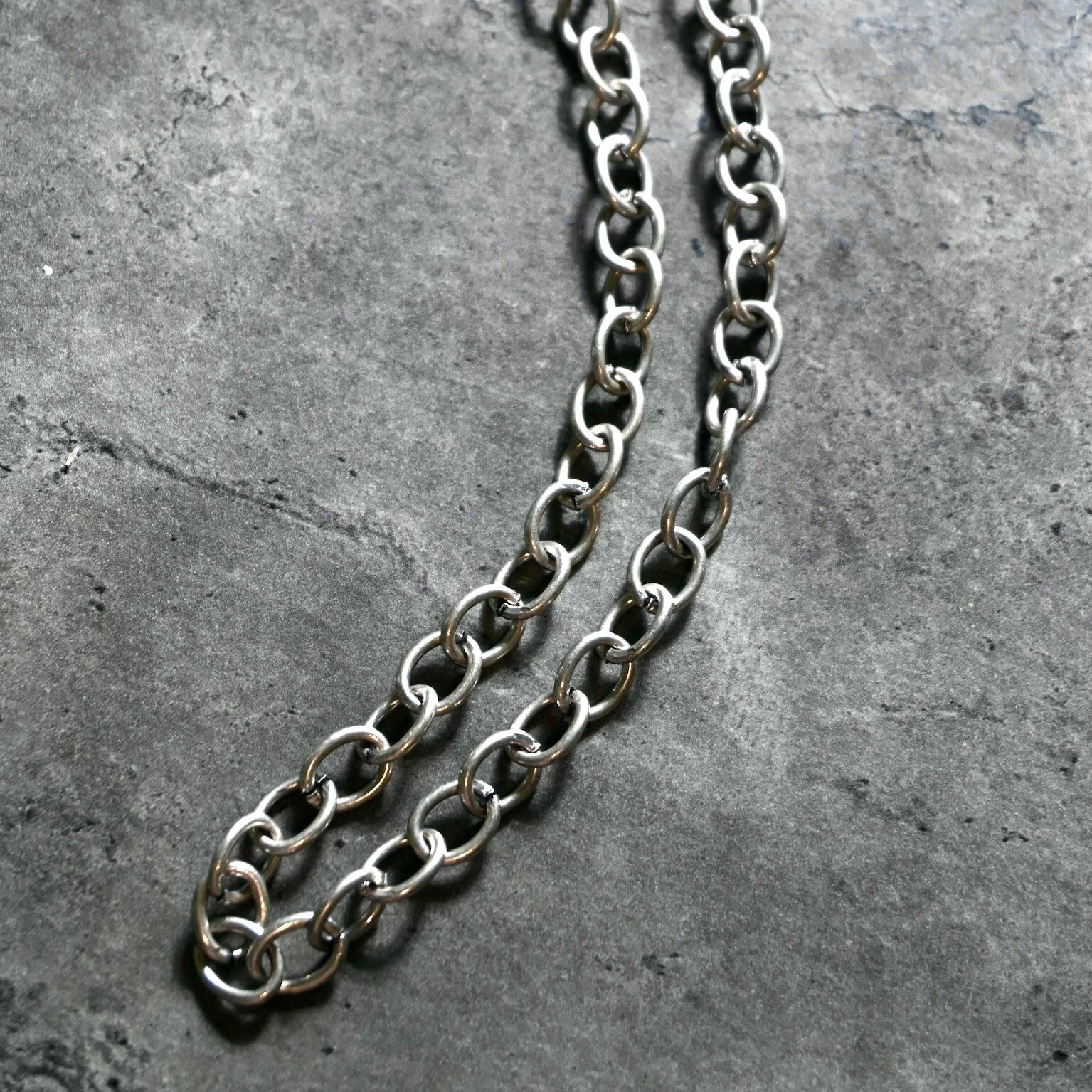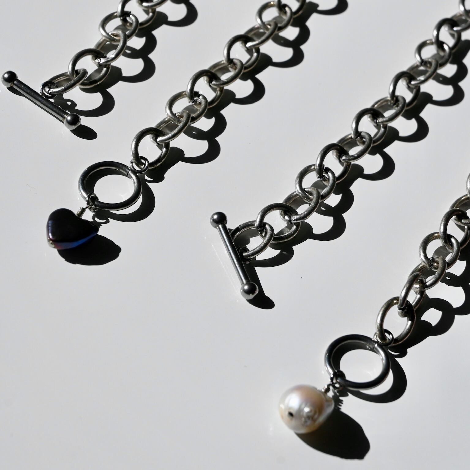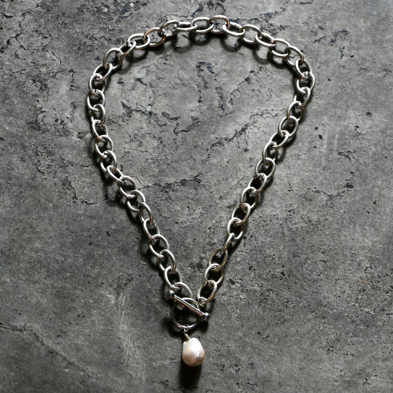 シンプルな“ストリート”דモード”なスタイルを底上げするシルバーチェーンと淡水バロックパールのネックレス。