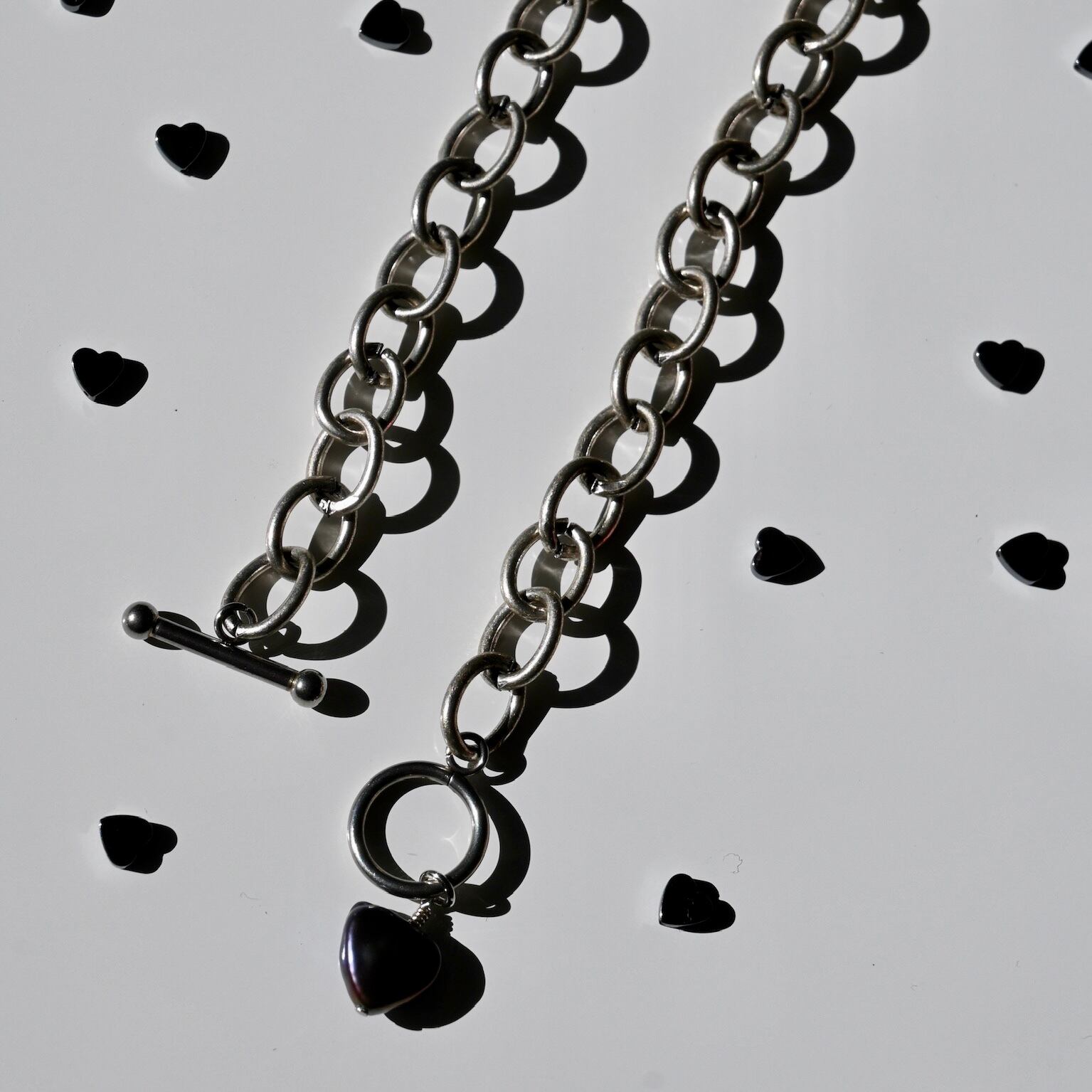 パールは大変希少な美しいブラック染のハート形核入りパールを使用しており、厚い真珠層が華やかな虹色の光沢を生み出しています。