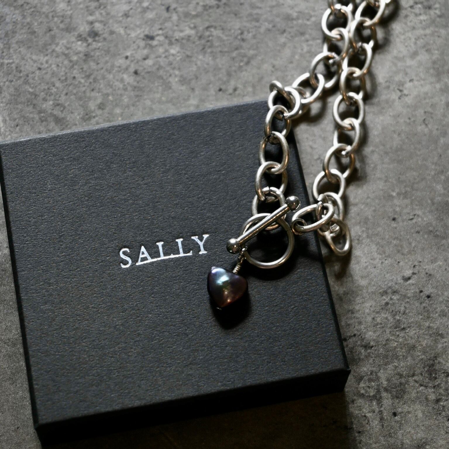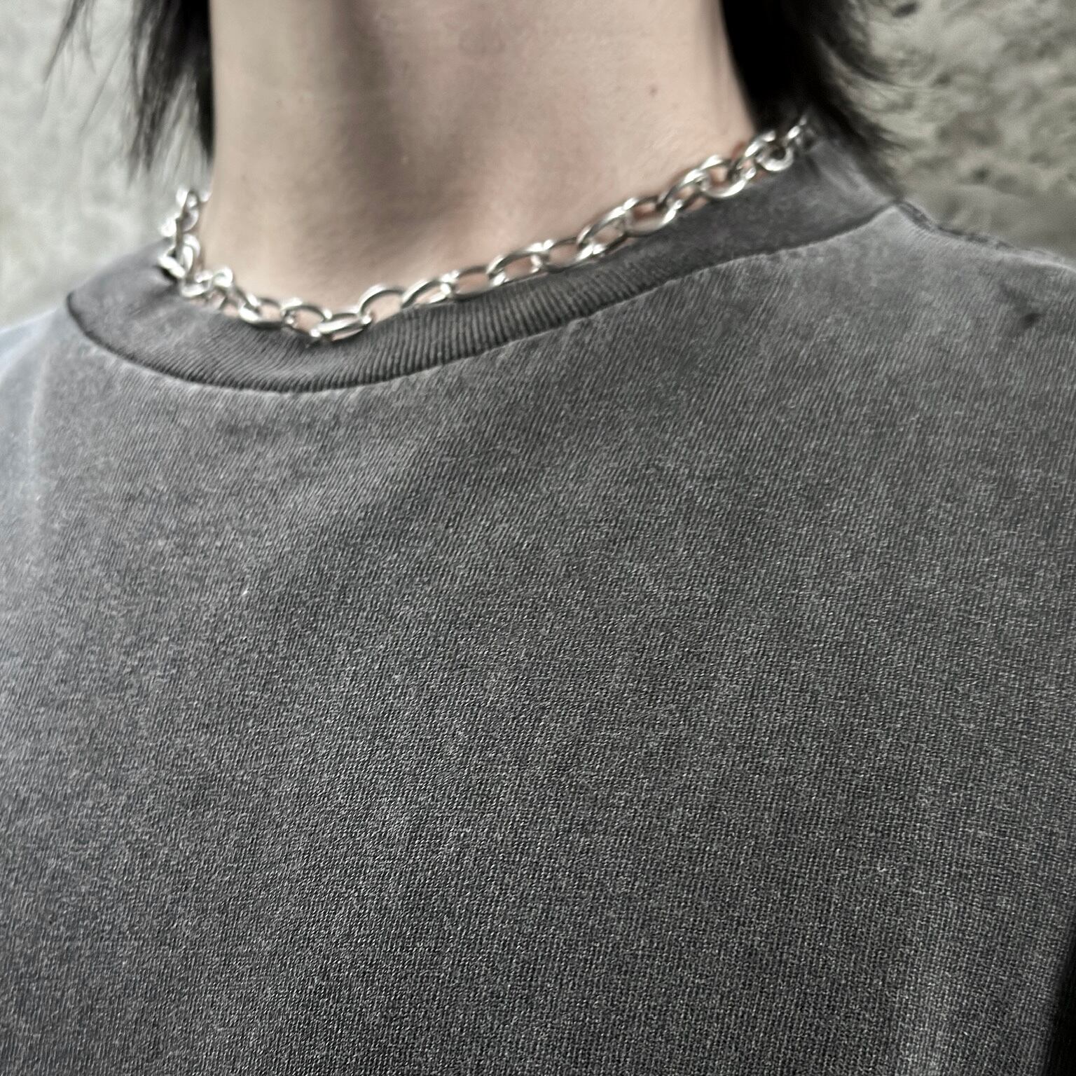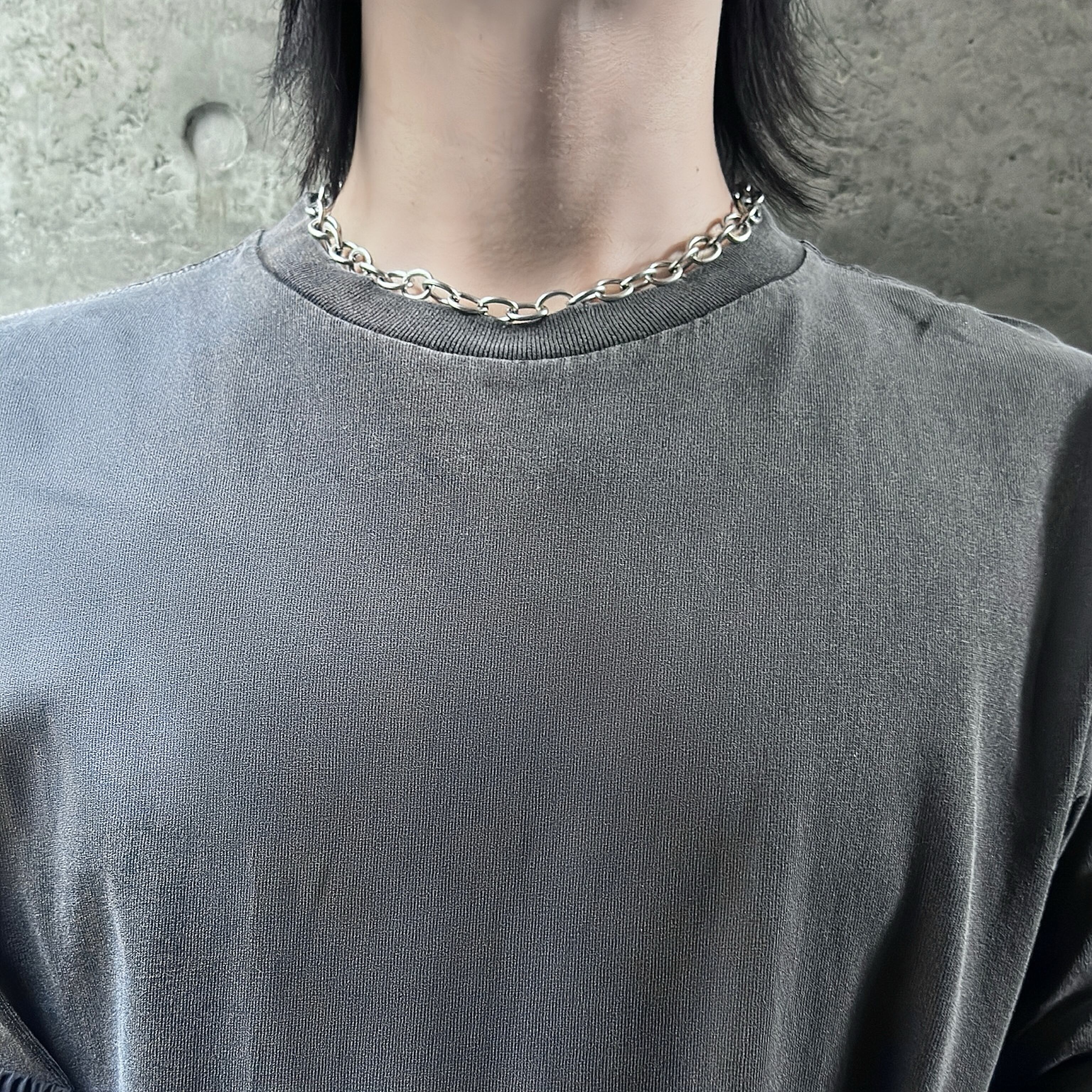 シンプルな“ストリート”דモード”なスタイルを底上げするシルバーチェーンと淡水バロックパールのネックレス。