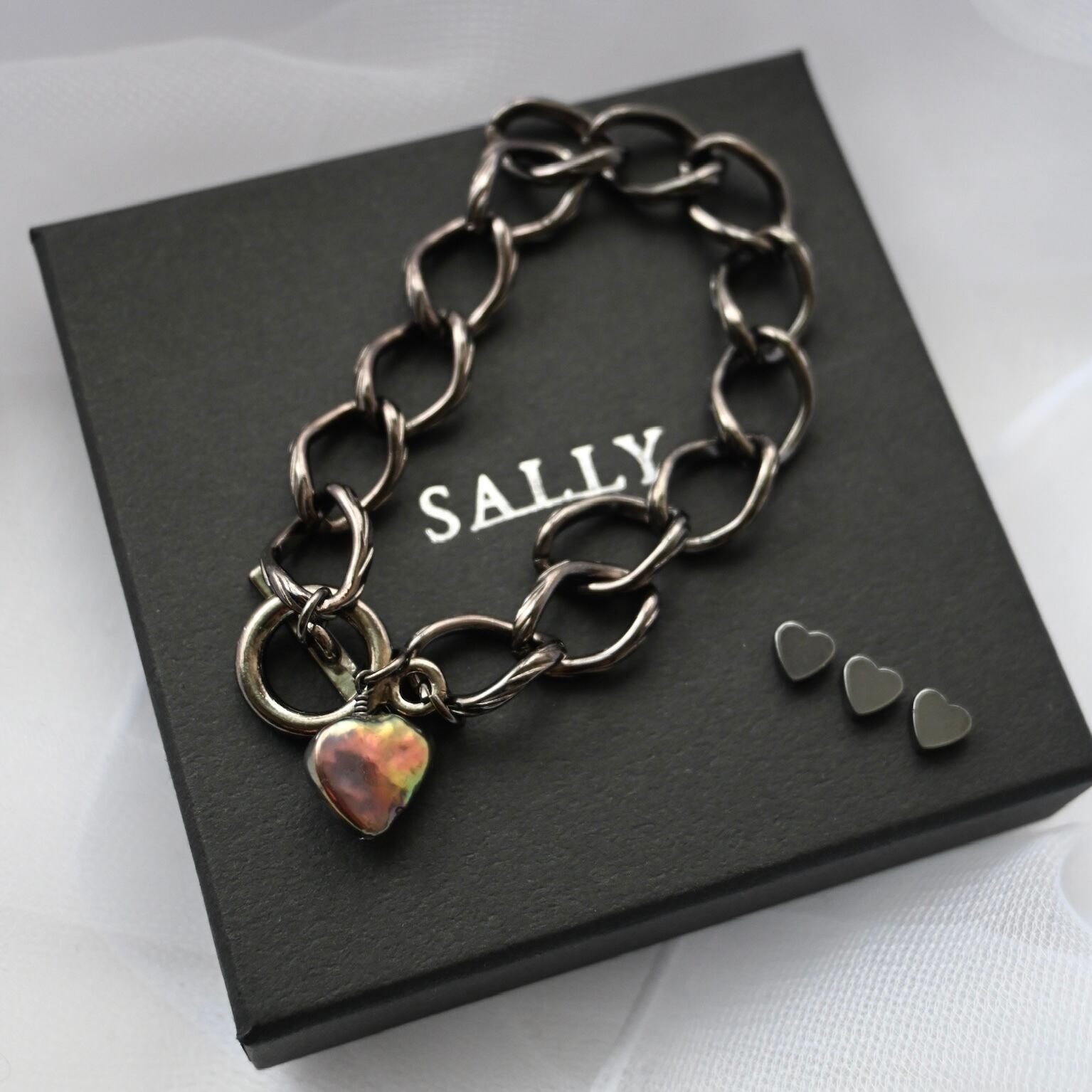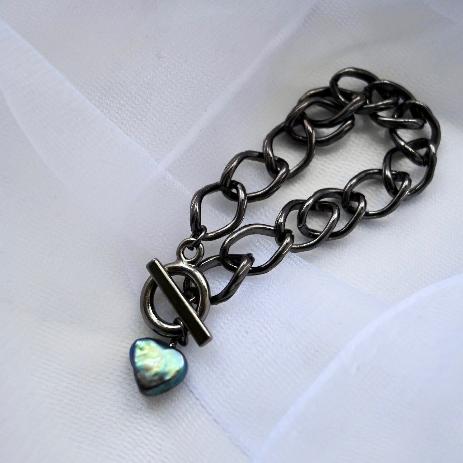 大変希少な美しいブラック染のハート形核入りパールを使用しており、