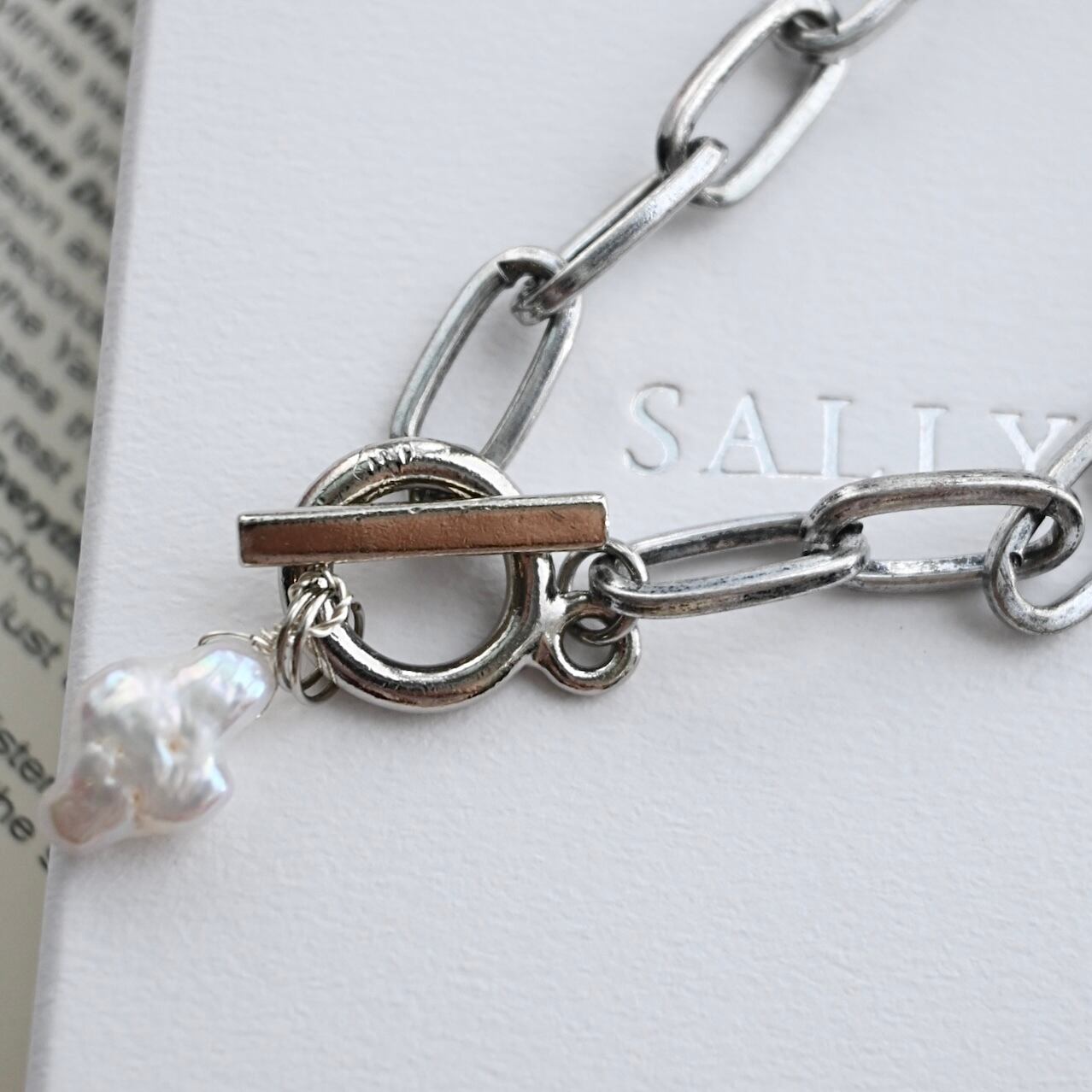 チェーンはパールのサイズに合わせて繊細、かつ線形のチェーンと無骨なマンテルが、十字架パールを引き立てる計算されたデザインです。